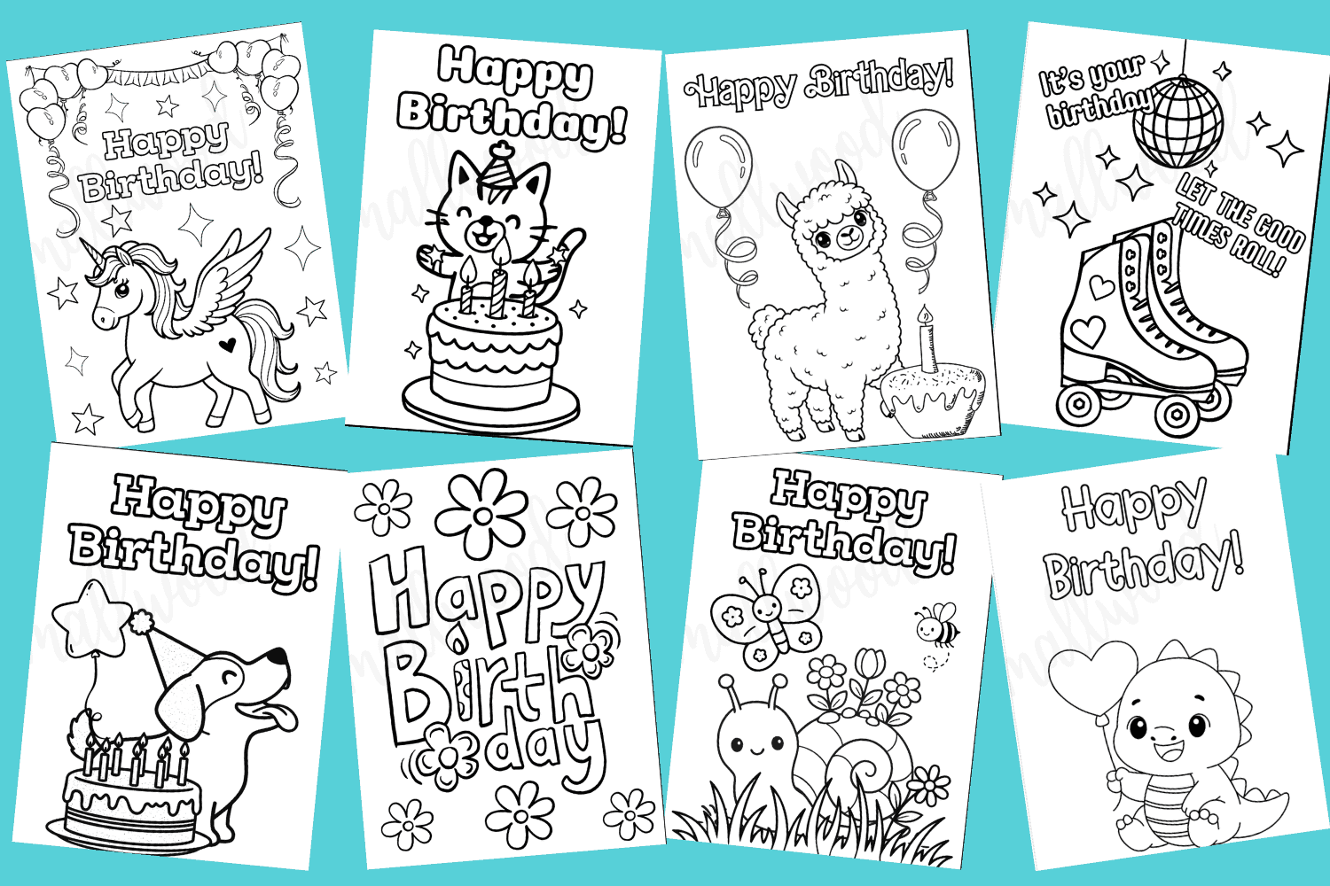 There are lots of different designs of coloring Happy Birthday cards, including flowers, birthday cake, cupcakes, animals, and roller skates.