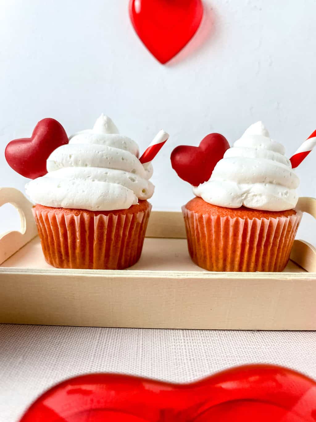 - Place the red stripe straws on one side of the swirl and then put the chocolate hearts on the other side.
