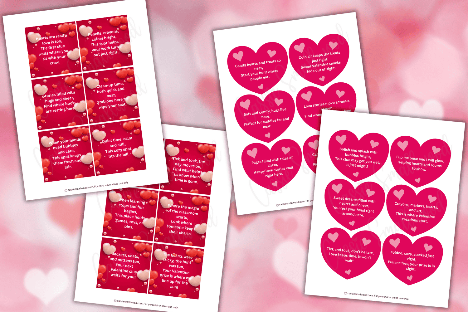 Whether you’re hiding candy, stickers, or small treats, these hunts get kids moving, thinking, and giggling as they follow heart-filled clues from one spot to the next. In this post, we’ve created ready-to-use scavenger hunt clues for both at-home and classroom settings, with rhymes that spark curiosity and locations kids can easily find. From desks and bookshelves to coat hooks and cozy corners, there’s a clue for every space, and a fun Valentine surprise waiting at the end!